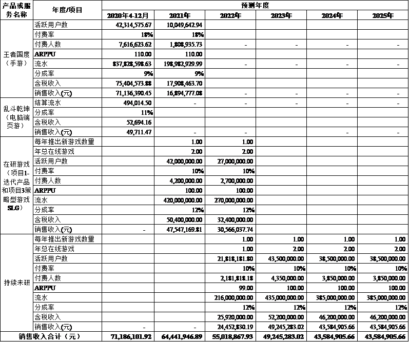 根據上述預測思路及計算模型,對標的公司2020年度4月1日至2025年度游戲項目主營業務收入進行了預測,2026年以后企業按2025年營業收入保持穩定進行預測。
