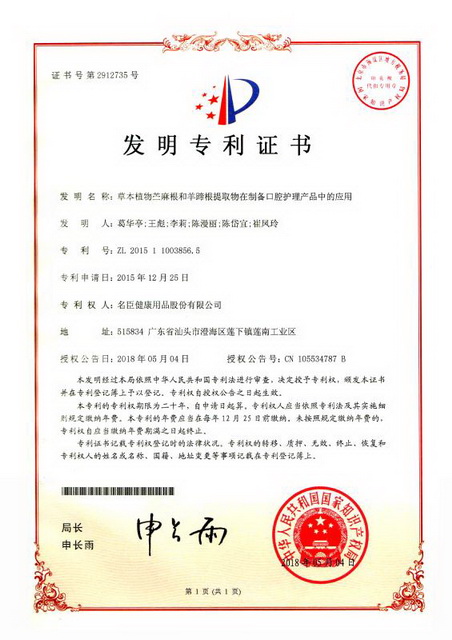 以葛華亭工程師為帶頭人的研發(fā)創(chuàng)新團隊在口腔護理領域的創(chuàng)新成果先后獲得 “一種四味明目中藥牙膏”(授權發(fā)明專利號:ZL201511004983.7)和“草本植物苧麻根和羊蹄根提取物在口腔護理產(chǎn)品中的應用”(授權發(fā)明專利號:ZL201511003856.5)等二項發(fā)明專利授權。這二項發(fā)明專利在傳統(tǒng)中醫(yī)藥成果的基礎上,將傳統(tǒng)優(yōu)秀技術成果與現(xiàn)代科學技術相結合,為消費者提供更好的口腔護理保障。