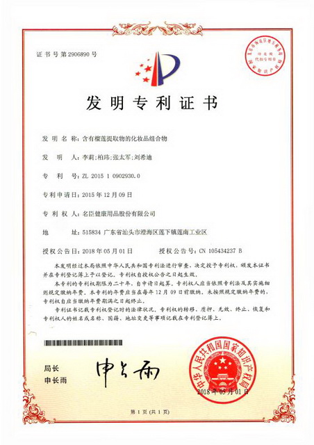 由名臣健康新生代優(yōu)秀工程師李莉為帶頭人的創(chuàng)新團隊,創(chuàng)新成果“含有榴蓮提取物的化妝品組合物”(授權發(fā)明專利號:ZL201510902930.0)獲得國家知識產(chǎn)權局發(fā)明專利授權。該成果從水果皇后榴蓮中發(fā)現(xiàn)可對減輕皮膚色素沉積、減輕皮膚氧化應激和減少皮膚皺紋產(chǎn)生作用的成分,并經(jīng)科學篩選和驗證,發(fā)明了一種對皮膚極其有益的化妝品組合物。
