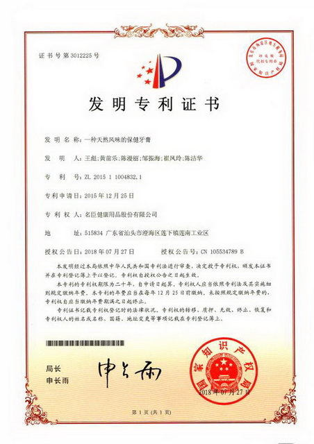 同期獲得國家知識產(chǎn)權局發(fā)明專利授權的還有公司研發(fā)創(chuàng)新新秀王彪工程師主導發(fā)明的“一種天然風味的保健牙膏” (授權發(fā)明專利號:CN201511004832.1)。
