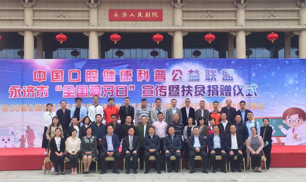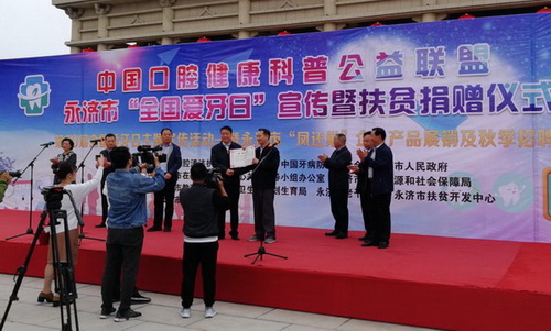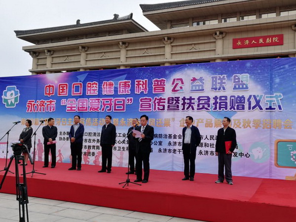 本次“愛牙日”公益宣傳捐贈活動,是由中國口腔清潔護理用品工業(yè)協(xié)會、中國牙病防治基金會、山西省永濟市人民政府攜手中國口腔健康科普聯(lián)盟成員單位名臣健康、上海美加凈、北京寶潔、聯(lián)合利華、納愛斯、強生、兩面針、奧奇麗、高露潔等23家愛心企業(yè)聯(lián)合舉辦。本次活動得到了當?shù)卣c行業(yè)協(xié)會的大力支持,也得到了各聯(lián)盟單位的高度重視、積極參與、熱心捐贈。永濟市委書記徐志英,市政府、市政協(xié)領導張延耀、李曉軍、孫晉民,以及中國口腔清潔護理用品工業(yè)協(xié)會理事長韓泰軍,協(xié)會常務副理事長、秘書長相建強,以及全國口腔清潔護理行業(yè)知名企業(yè)代表參加了本次活動。永濟市委書記徐志英在活動儀式上向捐贈方代表——中國口腔清潔護理用品工業(yè)協(xié)會頒發(fā)了榮譽證書,并與協(xié)會理事長韓泰軍及愛心企業(yè)負責人舉行座談會,與會人員一起觀看了《詩情畫意》永濟宣傳片和工作宣傳片,徐志英希望與會企業(yè),并通過與會企業(yè)宣傳永濟,推廣永濟,讓更多的人了解永濟,投資永濟,加入永濟的建設行列,在更廣泛的領域開展經濟、文化、技術合作,助力永濟經濟發(fā)展。他表示永濟市委、市政府將為企業(yè)在永濟投資興業(yè)提供全方位的服務,實現(xiàn)共同發(fā)展。