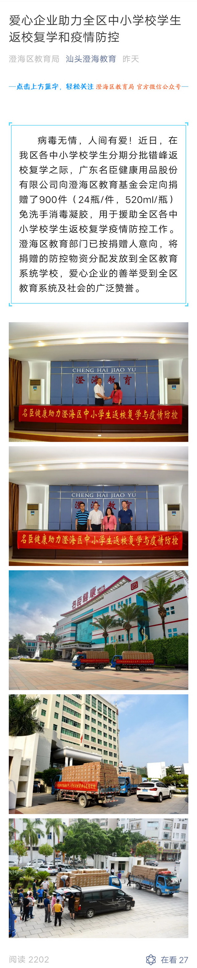 在全國中小學校學生分期分批錯峰返校復學之際,名臣健康用品股份有限公司向企業所在地汕頭市澄海區教育基金會定向捐贈了一批防疫產品,用于援助全區100多所中小學校學生返校復學的疫情防控。日前,澄海區教育部門已按企業意向,將公司捐贈的防疫產品分配發放到全區教育系統。企業的善舉,受到全區教育系統及社會各界的廣泛贊譽。