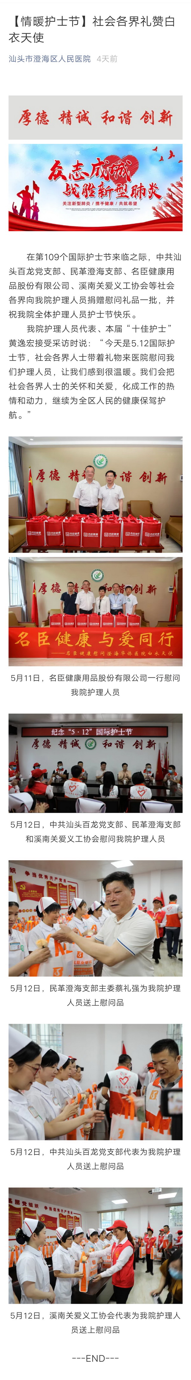 為褒揚白衣天使不畏艱險、甘于奉獻、救死扶傷、勇于獻身的人道主義精神,以及他們在踐行社會主義的人道主義,全心全意為人民服務宗旨中體現出的真心、愛心與責任心,名臣健康用品股份有限公司在5.12國際護士節之際,組織慰問汕頭市澄海區人民醫院護理人員,為他們送去公司生產的健康護理用品,以及節日的親切問候和誠摯慰問,彰顯了企業的社會責任。