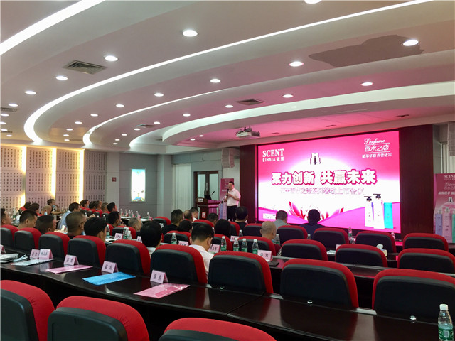 公司事業(yè)三部銷售總監(jiān)陳沛杰在新品發(fā)布會(huì)上作《依采香水之戀系列上市策略》