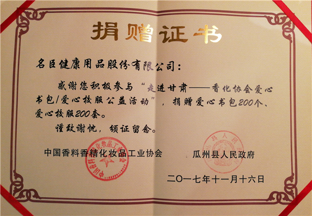 11月16日,名臣健康用品股份有限公司派出代表不遠千里,隨中國香化協會走進西北戈壁,來到甘肅河西走廊西端,古絲綢之路的商賈重鎮瓜州,參加由中國香精香料化妝品工業協會發起組織的愛心公益活動,為山區孩子捐贈愛心書包、校服和文具,傳遞名臣人拳拳愛心。