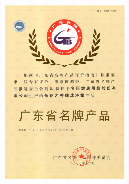 名臣健康用品股份有限公司繼之前“蒂花之秀沐浴露”獲國家質量監督檢驗檢疫總局頒發的中國名牌產品證書、“蒂花之秀護膚膏霜產品” 、“蒂花之秀洗發水產品”獲廣東省名牌產品證書之后,在昨天的2017年度廣東省名牌產品授牌大會上,又有“蒂花之秀沐浴露”與“蒂花之秀護發素”二個高新技術產品喜獲廣東省名牌產品授牌。